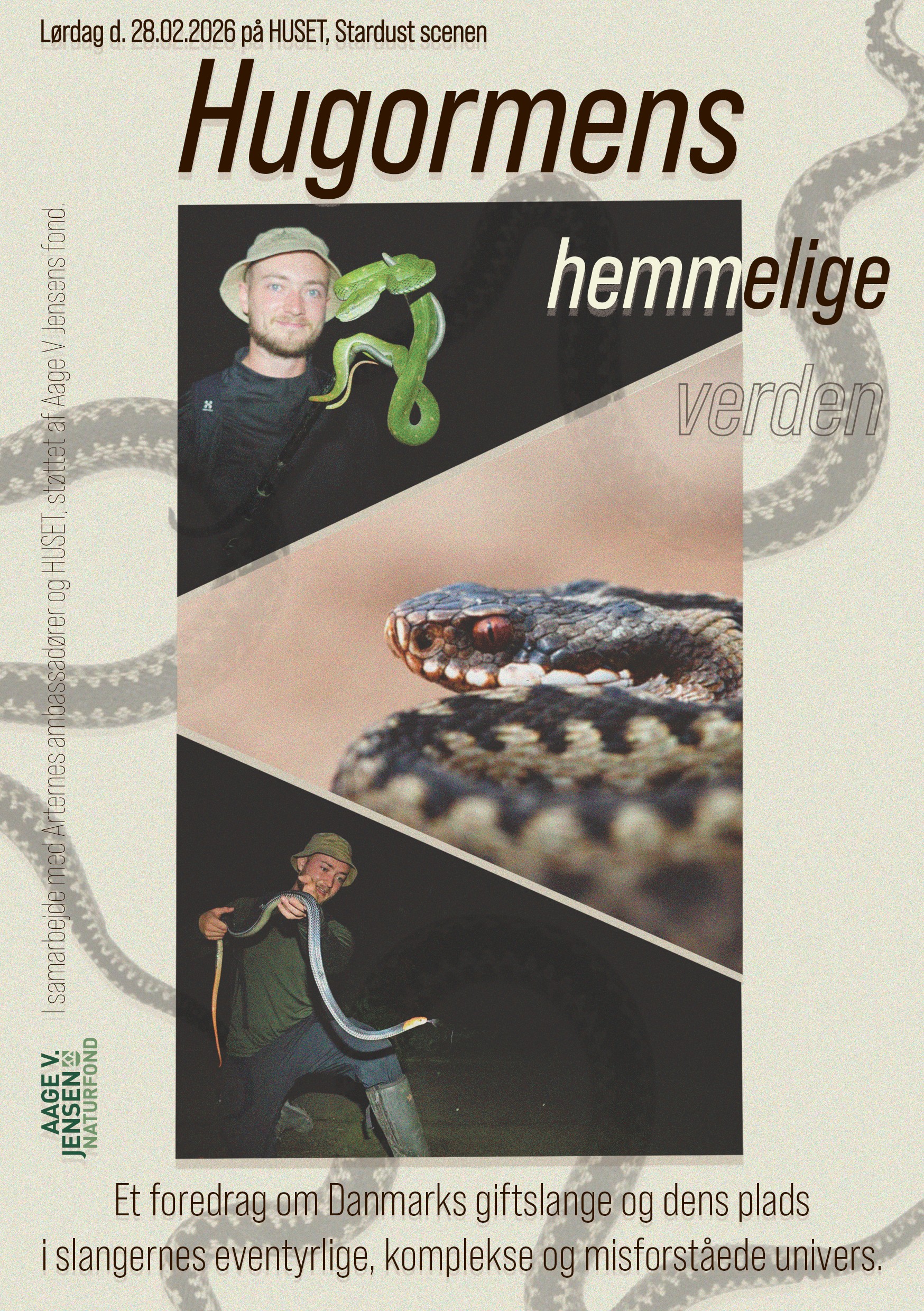Igennem foredraget vil naturformidler Magnus Kongsgaard inddrage observationer og detaljer lært igennem rejser rundt i Danmark og syd/øst asien på udkig efter hugorme og andre giftslanger og fortælle vilde, sande historier fra sine ekspeditioner.